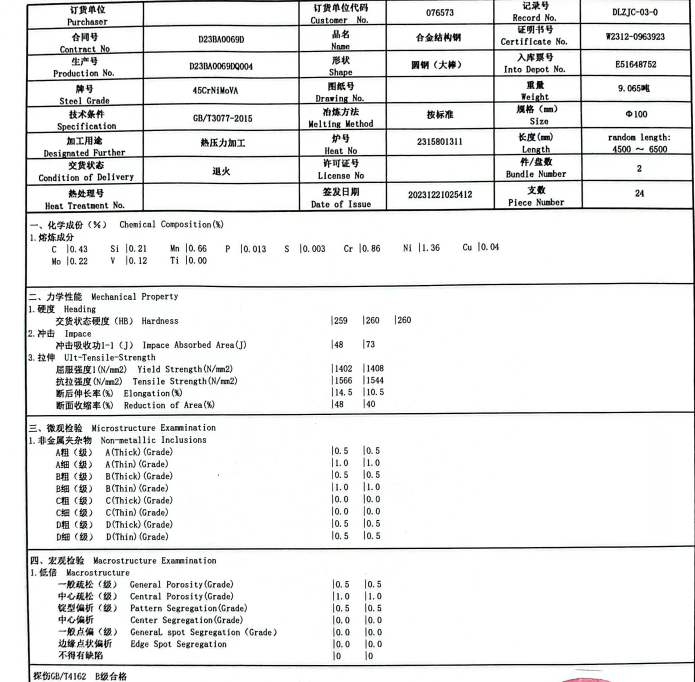 45CrNiMoVA圓鋼化學(xué)成分(質(zhì)保書)免費(fèi)查詢